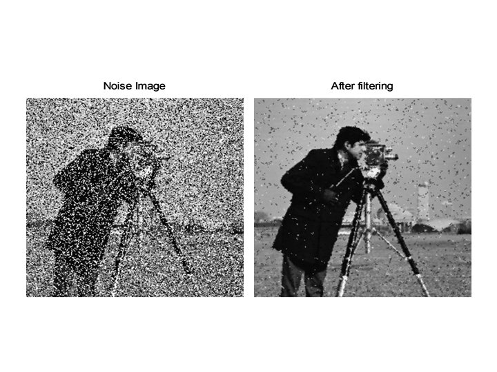 % Midpoint filter % Read a gray scale image and add gaussian noise and remove the noise using % midpoint filter clear all; close all; clc; f = imread('cameraman. tif'); f = imnoise(f, 'gaussian', 0, 0. 01); f = im 2 double(f); %subplot(1, 2, 1), imshow(f), title('Noisy Image'); figure, imshow(f), title('Noisy Image'); [m n]=size(f); Q=0; for i = 2: m-1 for j = 2: n-1 con=0; for k 1 = i-1: i+1 for p 1 = j-1: j+1 con = con+1; s 1(con)=(f(k 1, p 1)); end b 1=min(s 1); b 2=max(s 1); R_img(i, j)=(b 1+b 2)/2; end %subplot(1, 2, 2), imshow(R_img), title('Midpoint filtered'); figure, imshow(R_img), title('Midpoint filtered');