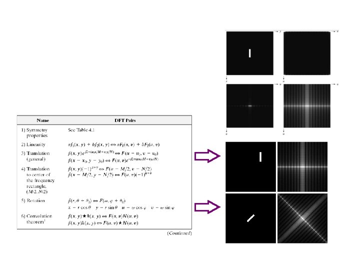 Computing 2 D-DFT IDFT n Discrete, 2 -D Fourier & inverse Fourier transforms are implemented in fft 2 and ifft 2, respectively fftshift: Move origin (DC component) to image center for display n Example: n >> >> I = imread(‘test. png’); F = fftshift(fft 2(I)); imshow(log(abs(F)), []); imshow(angle(F), []); % % Load grayscale image Shifted transform Show log magnitude Show phase angle