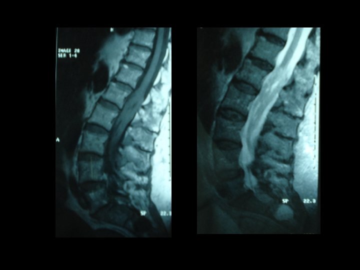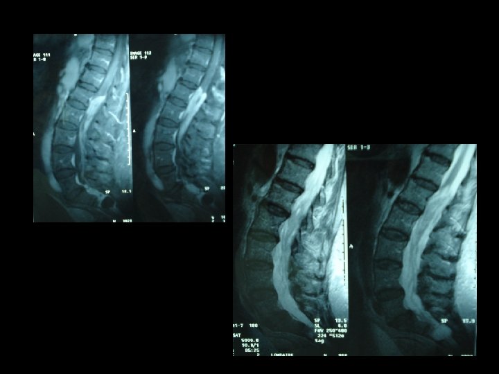 * Les examens biologiques misent en évidence une thrombopénie , une hypo albuminémie et une hypergammaglobulinémie modérée. Sérologie VIH était négative. * L’IRM lombaire pratiquée en séquence T 1, T 2 et avec injection du gadolinium montre un important épaississement des racines de la queue de cheval visible sur les coupes en séquence. T 2 qui se rehaussent intensément après injection du gadolinium.