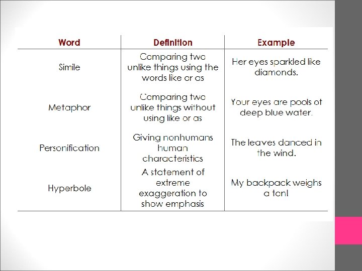 Imagery Metaphor Simile Personification Hyperbole Idiom Allusion Onomatopoeia
