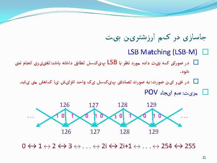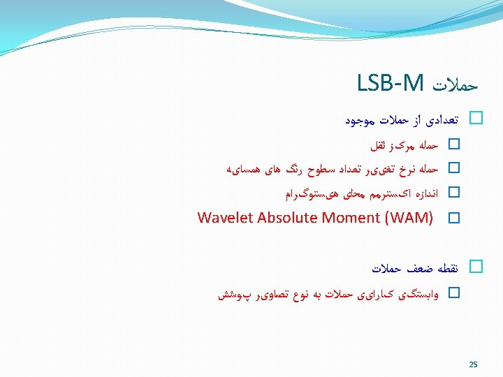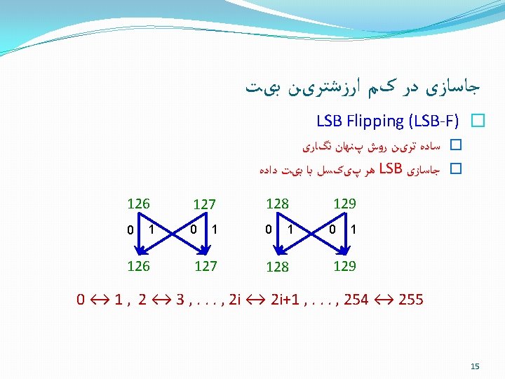 LSB-F ﻧﻘﻄﻪ ﺿﻌﻒ 2 3 100 50 LSB Cover image 2 3 75 75 Stego image Embedding with LSB Flipping creates POVs have equal frequencies in stego image Chi square attack 16