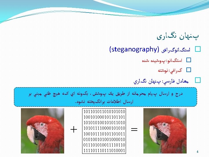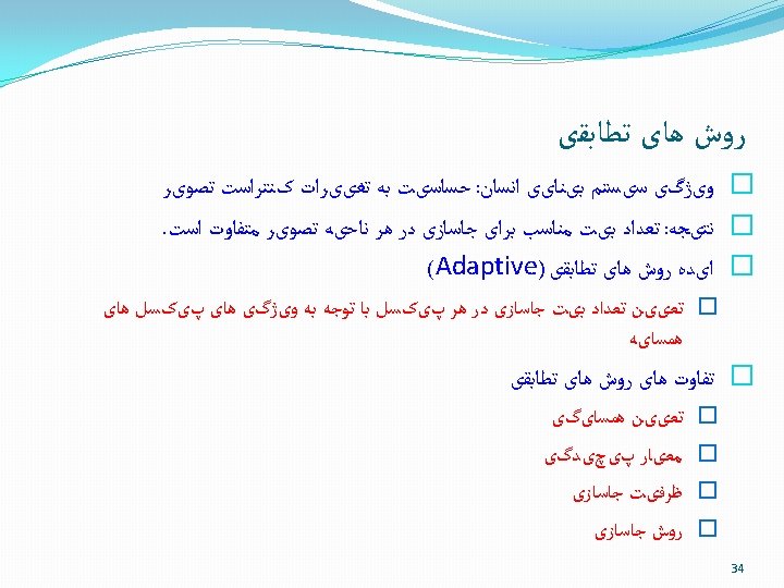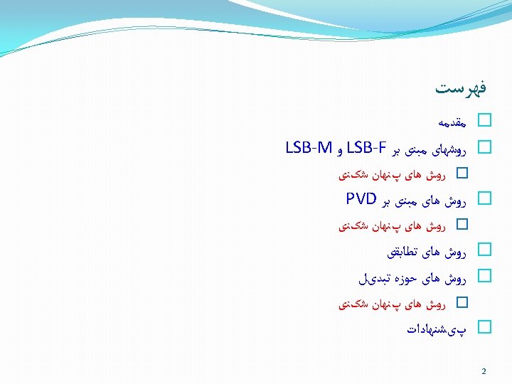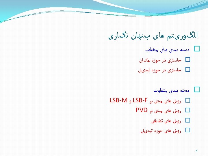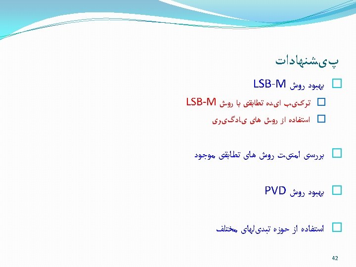 ﺭﻭﺵ ﻫﺎی ﺣﻮﺯﻩ ﺗﺒﺪیﻞ Embedding in spatial domain Lossy compression Compressed Uncompressed Embedded Data stego image Uncompressed image Embedding Data Compressed stego image = Extracted Data ? Uncompressed stego image Decompress Extracted Data Extraction 37