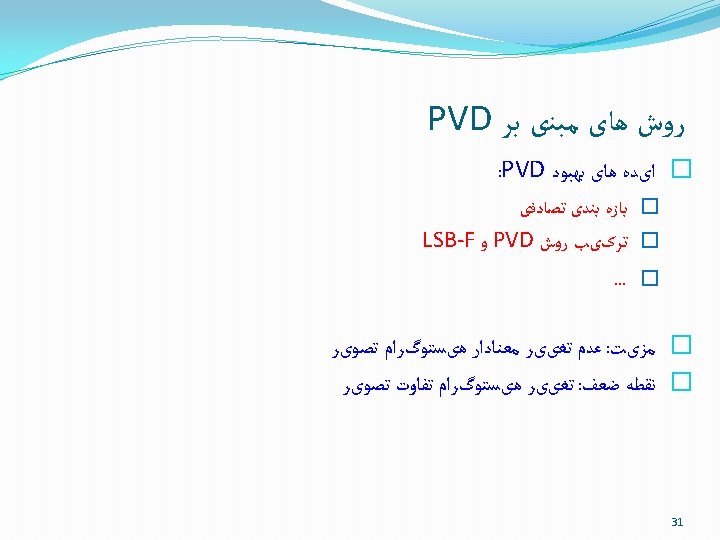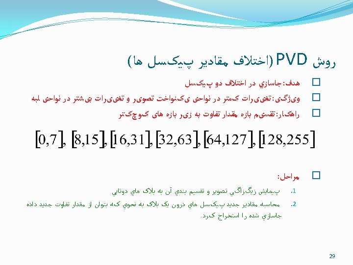PVD ﻣﺜﺎﻟی ﺍﺯ 1010 Data=10101110010100011010101100 B 1: (25, 50) d= 50 -25=25 B 1’: (24, 50) b=(1010)=10 d'=16+10=26 30