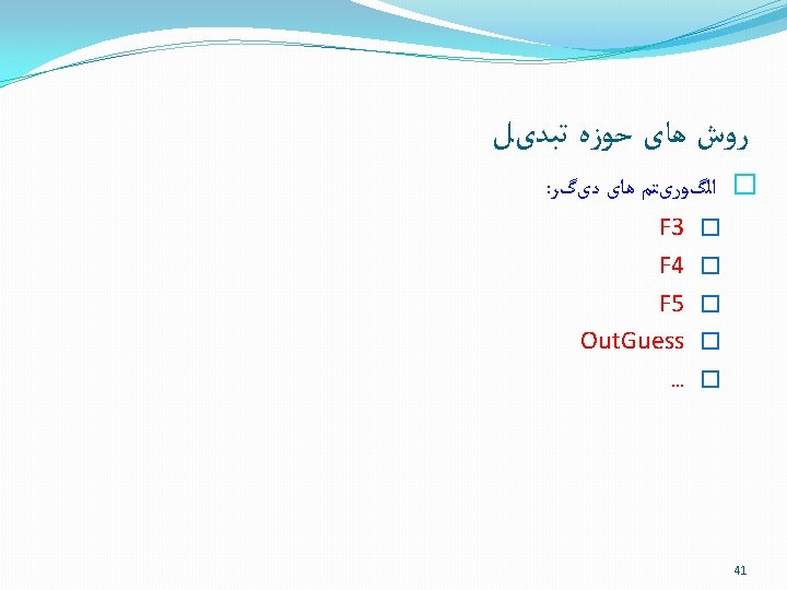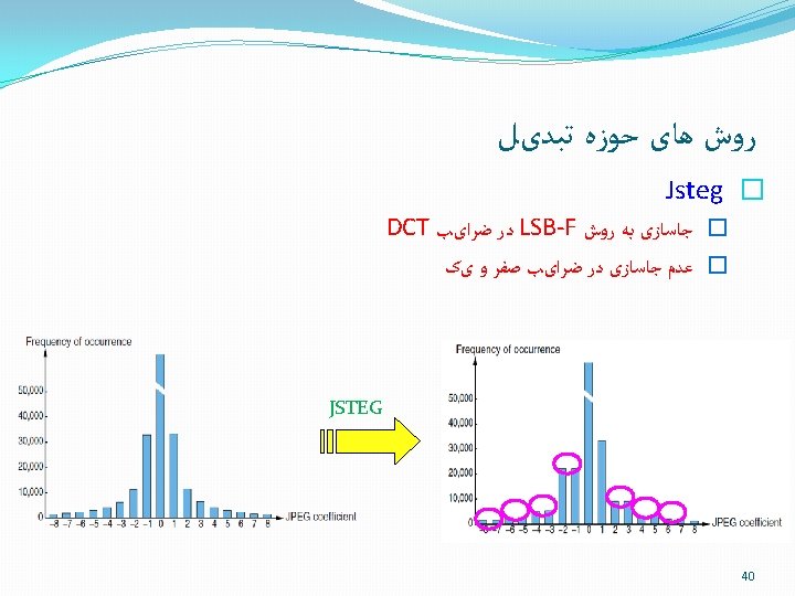ﺭﻭﺵ ﻫﺎی ﺣﻮﺯﻩ ﺗﺒﺪیﻞ DCT + Quantization Data Lossless Compression Uncompressed image DCT Coefficients Compressed image+Data (Stego image) Embedding in Transform Domain 39