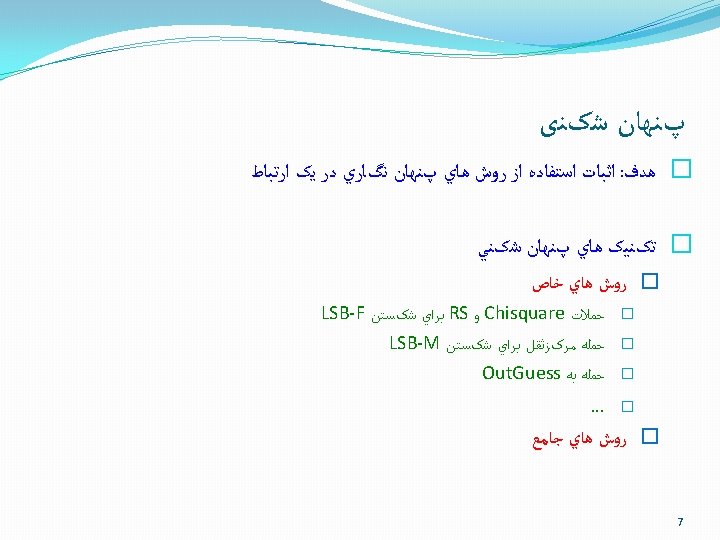LSB-M ﺑﻬﺒﻮﺩ LSB-M � ﺑﻬﺒﻮﺩ ﺍﻣﻨیﺖ ﻭ ﻇﺮﻓیﺖ High capacity LSB Matching (H-LSB-M) Adaptive LSB Matching (A-LSB-M) Adaptive high capacity LSB Matching (AH-LSB-M) Revised LSB Matching (R-LSB-M) Generalized LSB Matching (G-LSB-M) Content-Adaptive Steganography via Denoising (CAS-D) Content-Adaptive Steganography via Noise Estimation (CAS-NE) � � � � 26