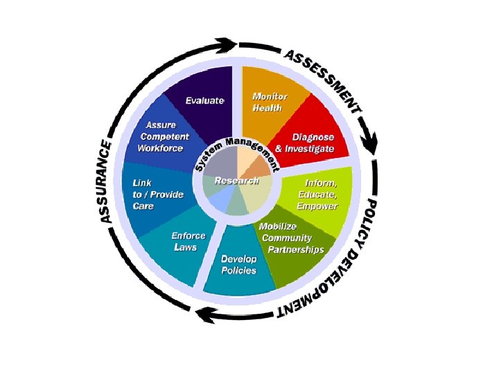 Essential Services • Assurance – Link people to needed personal health services and assure the provision of (environmental protection and) personal health services – Assure a competent public health and personal health workforce – Evaluate effectiveness, accessibility and quality of personal and population based health services (and the impact of budget changes) – Research for new insights and innovative solutions to health problems