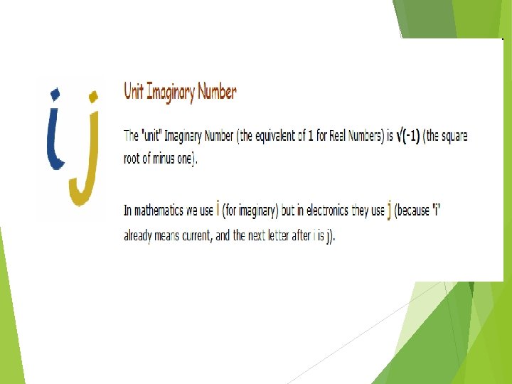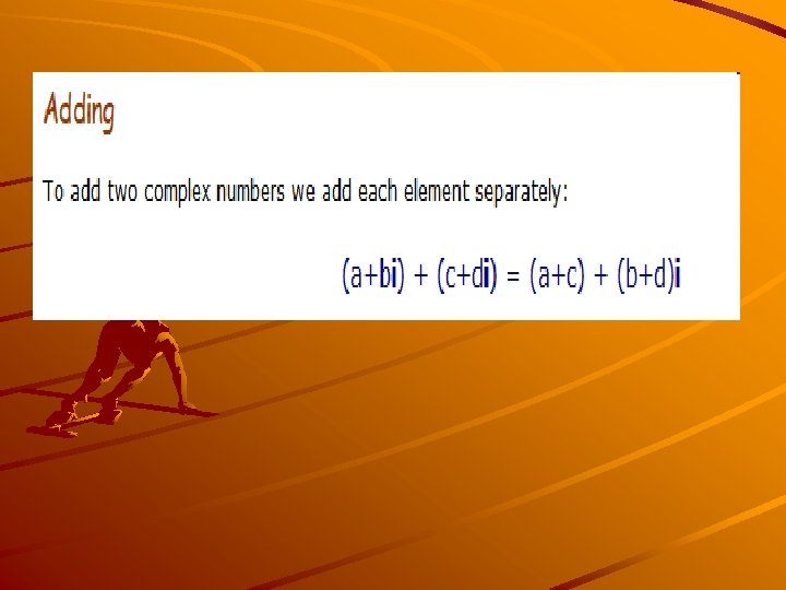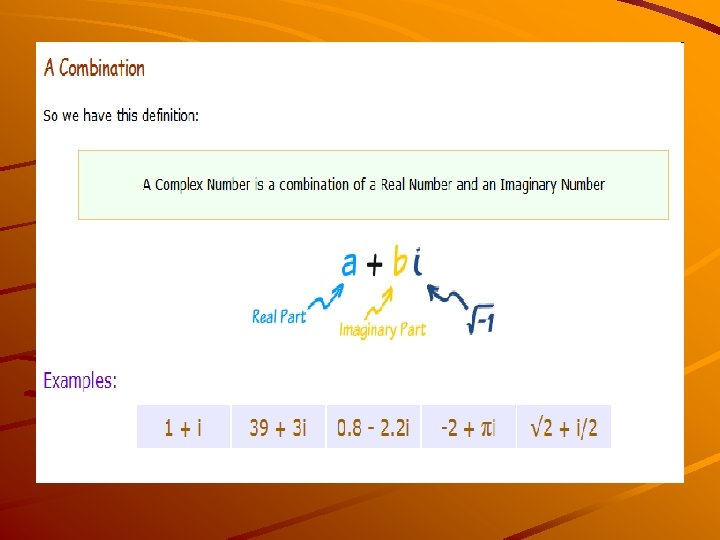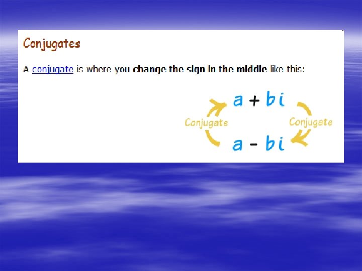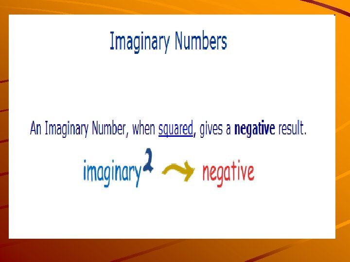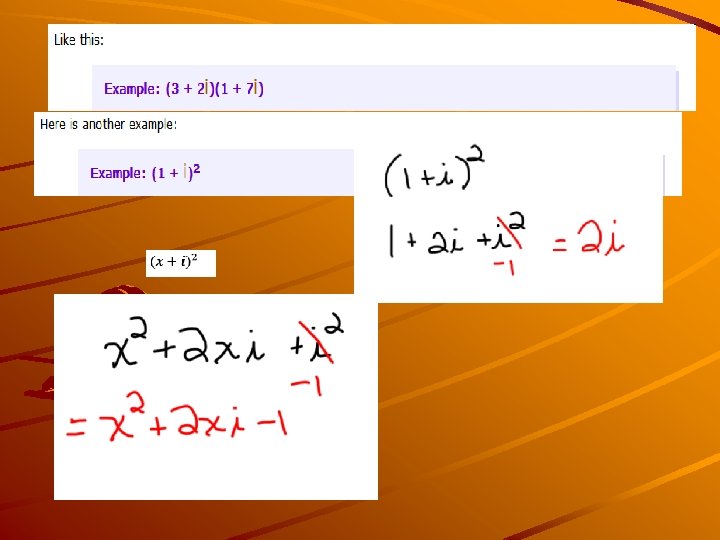 Aim: How can we simplify powers of i? If a whole number exponent is divided by 4, the remainder is 0, 1, 2, or 3. We can simplify powers of i by using the remainders after dividing by 4. Example: Write i 82 in simplest terms 82 = 20 remainder 2 4 The remainder equals the power of i Therefore i 82 is equivalent to i 2. So i 82 = -1