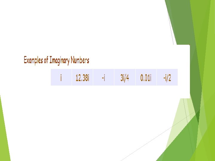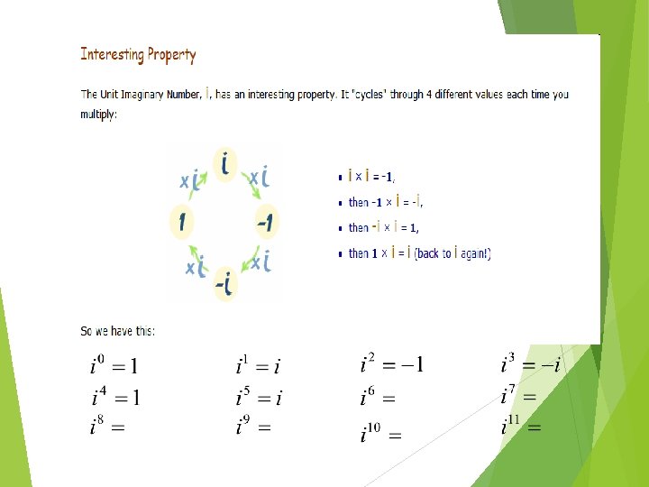 Aim: How can we simplify powers of i? Write each given power of I in simplest terms, as 1, i, -1, or -i i 12 2. i 91 3. i 49 4. i 54 1.