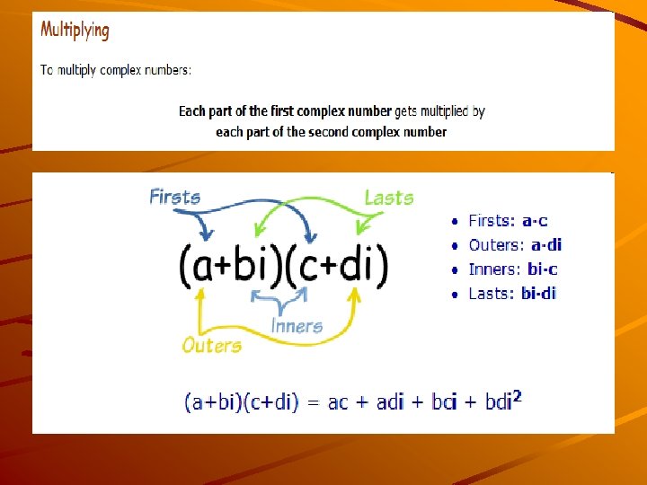 Aim: How can we simplify powers of i? Write each given power of I in simplest terms, as 1, i, -1, or -i 1. i 12 2. i 91 3. i 49 4. i 54 12/4=3 remainder 0 91/4 =22 remainder 3 49/4= 12 remainder 1 54/4 = 13 remainder 2 = i 0 = 1 = i 3 = -i = i 1 = i 2 = -1