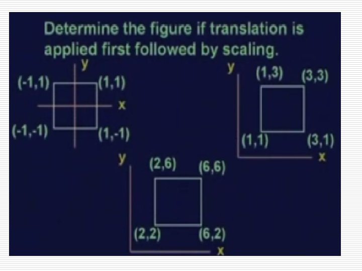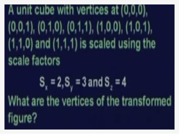 Scaling: o o The Scaling is easily accomplished by using the equations: X 2 = X 1 * sx ===>(i) Y 2 = Y 1 * sy Z 2 = Z 1 * sz ===>(ii) ===>(iii) Where (X 2, Y 2, Z 2) are new points and expressed in Matrix form as: V* = T X 2 Y 2 Z 2 1 sx = 0 0 sy 0 0 V 0 0 sz 0 0 1 X 1 Y 1 Z 1 1 Where T represents the Scaling Matrix. 13