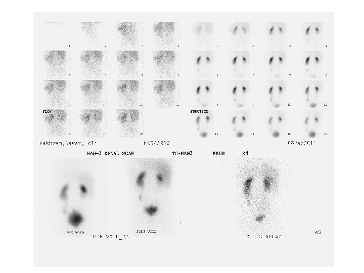 Nuclear medicine • Utilizes a gamma camera and radioactive isotopes. • Functional test. • Less expensive. • Useful for: obstruction and split function.