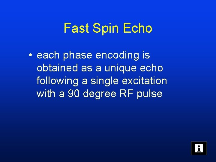 Fast Spin Echo scan time • • time-between-90 -degrees = TR total-number-of-unique-echos = phase encodings number-of-averages = NEX, NSA echo-train-length = ETL