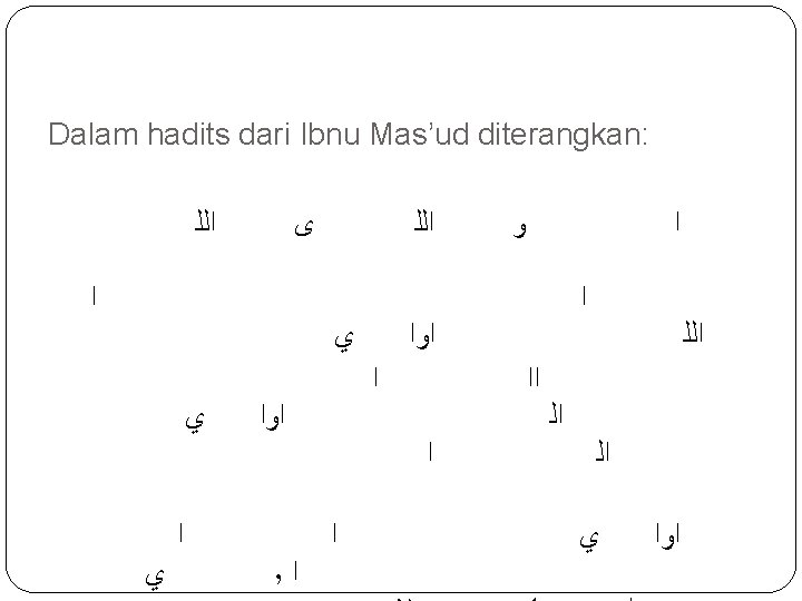ﻱ ﺍﻟﻠ ﻻ ﺍﺍ ﻹﺍ ﺍﻟﻠ ﺍ ﻱ ﺍ ﻻ ﺍﺍ Artinya : “Ada tujuh kelompok orang yang kelak mendapat perlindungan Allah di ﻭ yakni pemimpin ﻯ yang adil, hari tidak ada perlindungan kecuali perlindungan. Nya, pemuda yang tumbuh (hidup) untuk beribadah kepada Allah, seseorang yang ﺍﺍ ﺍﻟﻠ ﺍ ﺍﻱ hatinya ﺍﺍ ingin selalu kembali ke selalu terkait dengan masjid; jika ia keluar dari masjid ﺍ ﺍﻟﻠ itu lagi, dua orang yang saling mencinta karena Allah; mereka berkumpul dan berpisah ﺍ karena Allah, orang yang berdzikir kepada Allah dalam keadaan sunyi sehingga ﺍ ﺍ diajak berbuat serong oleh seorang meleleh air matanya, seseorang yang ﺍﻟﻠ ﺍ ﻱ ﺃ perempuan ﺍ ﺍ yang punya kedudukan lagi cantik; ia menolak dengan mengatakan: ‘saya takut ﻟﺍ kepada Allah Tuhan semesta alam’, dan orang yang bershadaqah kemudian