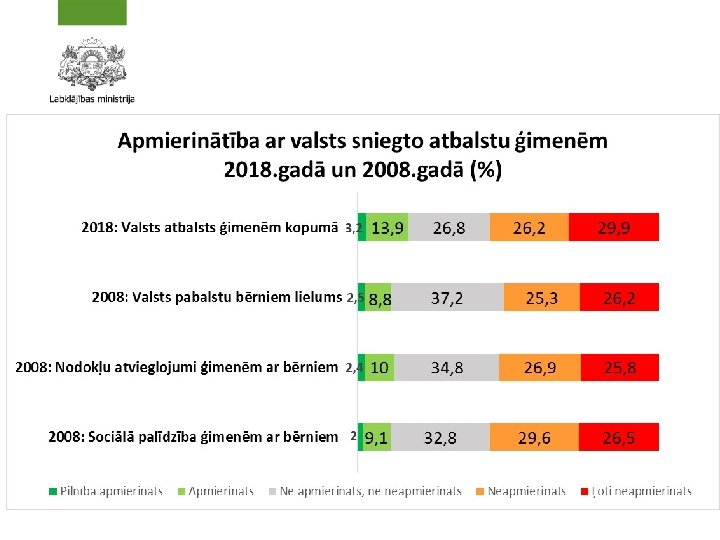 Rezultatīvie rādītāji un to sasniegšanas pakāpe Atbalsts vecāku pienākumu īstenošanai 1 Uzlabojas bērnu attīstībai un audzināšanai labvēlīgi apstākļi 1 Aukļu dienestu pašvaldībās skaits, kurās piesaistīts valsts finansējums 3 2 Uzlabojas ģimeņu vērtējums par valsts Pieaug ģimeņu ar bērniem atbalstu ģimenēm ar bērniem apmierinātība ar dzīves kvalitāti Iedzīvotāju īpatsvars %, kuri ir apmierināti ar valsts atbalstu ģimenēm ar bērniem 5 4 Komersanti ir «ģimenei draudzīgāki» Samazinās nabadzības riskam pakļauto ģimeņu īpatsvars Aptaujāto iedzīvotāju, kuru aprūpē ir bērni, īpatsvars %, kuri ir apmierināti ar sadzīves apstākļiem Komersantu skaits, kuriem piešķirts „Ģimenei draudzīga komersanta” statuss Nabadzības riska indekss mājsaimniecībām ar apgādībā esošiem bērniem, % 2 5 2009. g. 1 38, 7 1 56 1 9 21, 4 2014. g. * 3 n/a 20 20, 8 20 55, 5 2 57, 3 2 31 2017. g. 34, 3 ģimenēs ar un 19, 8 ģimenēs ar un 14, 4 ģimenēs ar un vidēji: 18, 4 Sasniegts * 1 2 Sasniegts Rezultāti atbilstoši Vidussposma izvērtējumā norādītājam, LM SKDS. Latvijas iedzīvotāju aptauja „Demogrāfija un ģimenes stāvoklis Latvijā”. Rīga, 2008. gada jūlijs. Izvērtējuma ietvaros veiktā iedzīvotāju aptauja. . Sasniegts Daļēji sasniegts – saglabājas augsts dažās soc. grupās