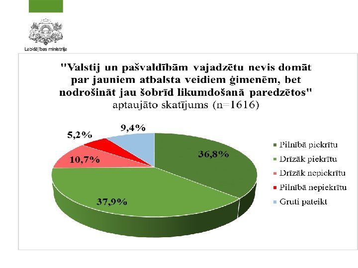 Vislielākais respondentu atbilžu īpatsvars tika saņemts attiecībā uz šādiem politikas iniciatīvu priekšlikumiem jānodrošina ilgākas darbnespējas lapas vecākiem, kuru bērniem diagnosticētas un tiek ārstētas smagas slimības (62, 1%), jānodrošina bezmaksas ēdināšanu bērnudārzos (59, 8%) jānodrošina apmaksāta atvaļinājuma iespējas ārkārtas gadījumos, kad nepieciešams rūpēties par smagi slimiem vai aprūpējamiem tuviniekiem laika periodā līdz 2 vai 3 nedēļām (55, 3%)