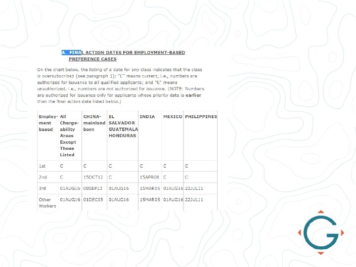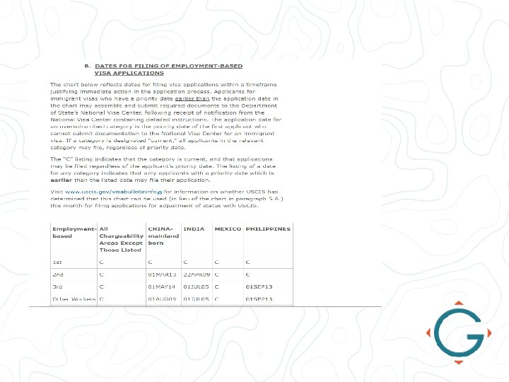 Changes to the Visa Bulletin In September DOS made big changes to the Visa Bulletin Seemed to be a coordinated effort with USCIS Both agencies had publication/information The October bulletin was the first of the “new” process Each category has two different charts of dates One chart is the same as before and termed “Date for Final Action” The second chart has earlier dates and is called the “Dates for Filing Applications” As originally published, the October bulletin had some crazy dates for “Dates for Filing”. So, a revised October bulletin was issued before October 1 with much later dates Kerfuffle, Lawsuit, Mayhem October 14, 2015 – USCIS states Beginning with the November 2015 Department of State (DOS) Visa Bulletin, if USCIS determines that there are more immigrant visas available for a fiscal year than there are known applicants for such visas, we will state on www. uscis. gov/visabulletininfo that applicants may use the Dates for Filing Visa Applications chart. Unless otherwise stated on our website, the Application Final Action Date chart will be used to determine when individuals may file their adjustment of status applications. And we will do it within one week of DOS putting out the visa bulletin
