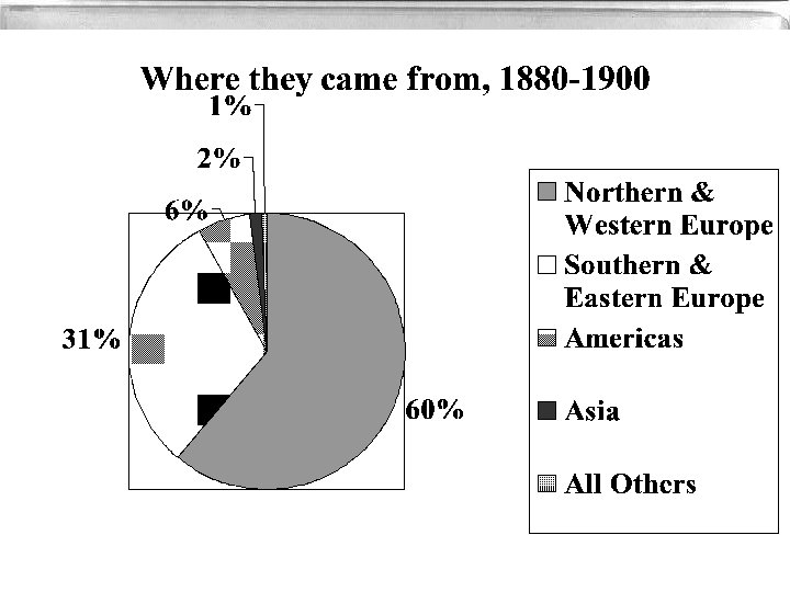 Immigration • Pre-1880 s, most immigrants came from Europe (English, Scots, Irish, Germans, & Scandinavians) • The door was wide open for Europeans - In the 1880 s alone, 9% of the total population of Norway emigrated to America. • By late 1800 s, fewer northern Europeans came because they found jobs in factories and mills in Europe.