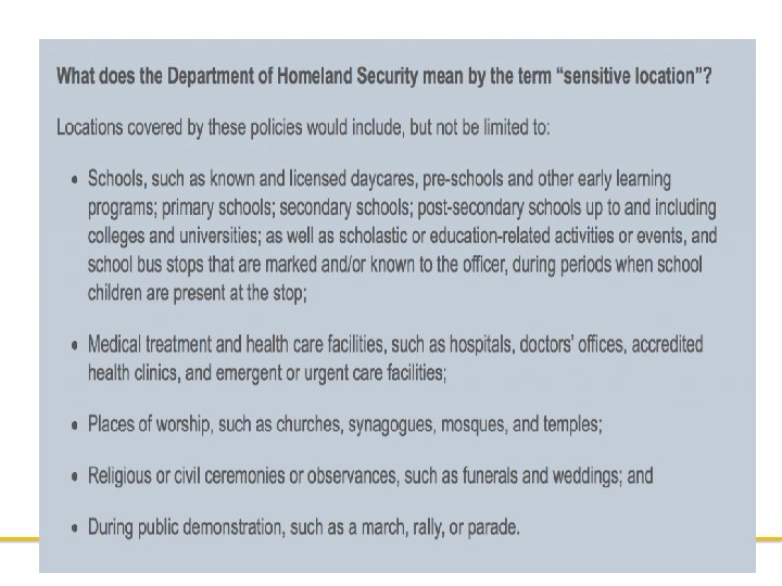 Would ICE Enforcement Happen Here? Ctd. This is not an exhaustive list—ICE also required to exercise caution at organizations assisting children, pregnant women, victims of domestic abuse or individuals with significant mental or physical disabilities. If your location could constitute a “sensitive location” under these policies, your staff should be trained to make this clear to immigration agents and/or their supervisor if they do show up to the location.