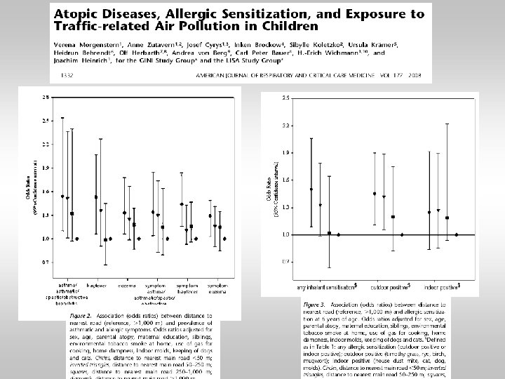 Traffic exposure and Allergy: Own Studies Sensibilisierung (RAST) gegen Pollen (Birke, Gras, Beifuß) Symptome einer allergischen Rhinitis MIRIAM Augsburg 1996 %-Anteil Mädchen mit Pollen- Sensibilisierung WIKA Study NRW 1991 -1997 40 30 20 10 0 339 <4000 Kfz 433 341 >4000 Kfz >10000 Kfz Verkehrsstärke Traffic exposure study Düsseldorf 1996