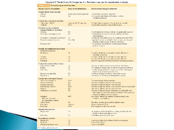 Route of Administration and Side Effects of Vaccines • • • Most vaccines are injected by subcutaneous, intramuscular, or intradermal routes Only a few oral vaccines available, even though they have advantages Some vaccines required the addition of an adjuvant Common side effects – Local reactions at the injection site – Fever – Allergies Some patients experience reactions to the medium rather than the antigens