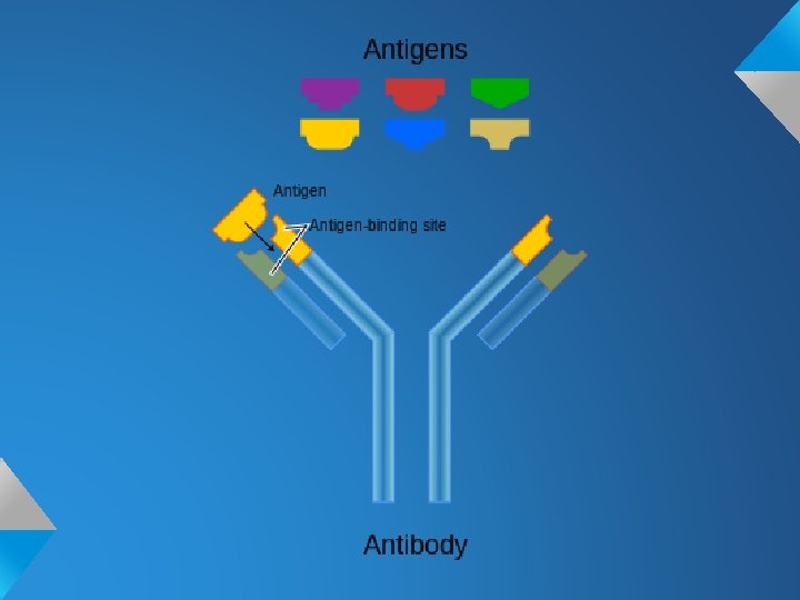 6. 3. 5: Distinguish between antigens and antibodies. Antibodies • • • Protein molecules produced in response to a specific pathogen Therefore, each antibody is different. . But all have are a "Y" shaped protein Antigens • • • Foreign proteins embedded in the outer surface of the pathogen (i. e. the capsid of a virus) These trigger an immune response Most pathogens have several different types of antigen and so may trigger the production of several different types of antibody At the end of the forked end of the antibody, there is a binding site where the antibody attaches itself to the antigen, and thus the pathogen.