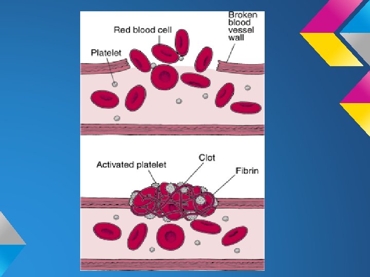 11. 1. 1: Describe the process of blood clotting Plasma Proteins and platelets circulate in blood plasma. Two Clotting Proteins: Remain inactive until receive a signal. -prothrombin -fibrinogen 1. Damaged cells release chemicals which stimulate platelets to adhere to the area. 2. Other platelets begin adhering, eventually forming a barrier or plug. 3. A signal is sent to bring prothrombin to the area. 3. The damaging tissue and platelets also release clotting factors which convert prothrombin into thrombin. -Thrombin is produced to lead to the production of fibrinogen and eventually fibrin which makes up the clot.