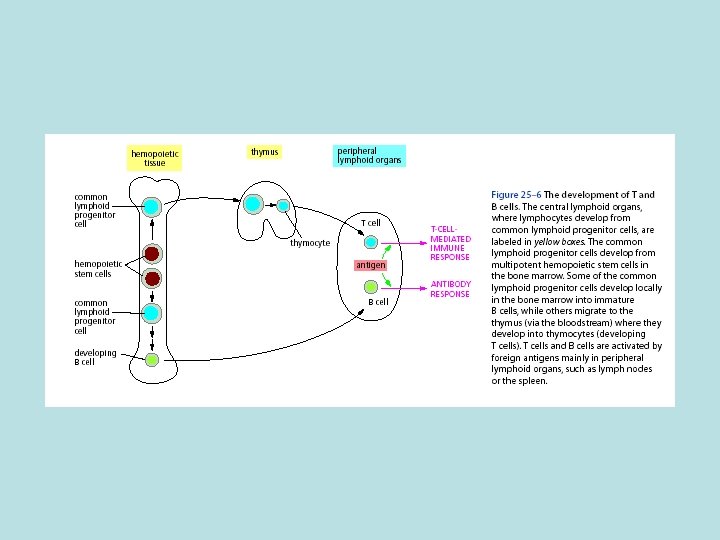 Lymphocytes B cell: A type of white blood cell and, specifically, a type of lymphocyte. Many B cells mature into what are called plasma cells that produce antibodies (proteins) necessary to fight off infections while other B cells mature into memory B cells. All of the plasma cells descended from a single B cell produce the same antibody which is directed against the antigen that stimulated it to mature. The same principle holds with memory B cells. Thus, all of the plasma cells and memory cells "remember" the stimulus that led to their formation. The maturation of B cells takes place in birds in an organ called the bursa of Fabricus. B cells in mammals mature largely in the bone marrow. The B cell, or B lymphocyte, is thus an immunologically important cell. It is not thymusdependent, has a short lifespan, and is responsible for the production of immunoglobulins. It expresses immunoglobulins on its surface. T cell: A type of white blood cell that is of key importance to the immune system and is at the core of adaptive immunity, the system that tailors the body's immune response to specific pathogens. The T cells are like soldiers who search out and destroy the targeted invaders. TCR on the surface. Immature T cells (termed T-stem cells) migrate to the thymus gland in the medistinum, where they mature and differentiate into various types of mature T cells and become active in the immune system in response to a hormone called thymosin and other factors. T-cells that are potentially activated against the body's own tissues are normally killed or changed ("downregulated") during this maturational process. There are several different types of mature T cells. Not all of their functions are known. T cells can produce substances called cytokines such as the interleukins which further stimulate the immune response (T helper cells, CD 4+ cells). Citotoxic T cells (TC cells, or CTLs) destroy virus-infected cells and tumor cells, and are also implicated in transplant rejection. These cells are also known as CD 8+T cells since they express the CD 8 glycoprotein at their surfaces.