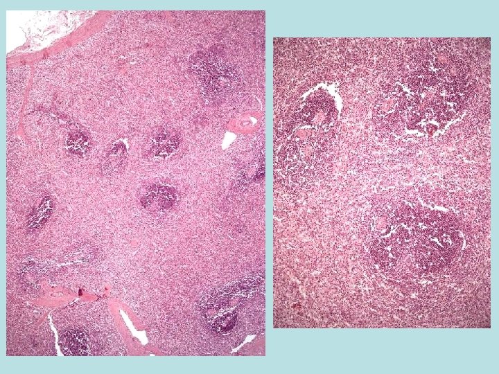 WHITE PULP: Central arteriole PALS (T cells) Splenic nodules (Malpighian nodules, B cells, a. is eccentric) Marginal zone (loose lymphoid tissue, B cells, marginal sinuses, macrophages).