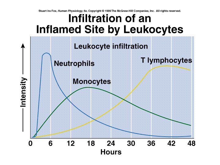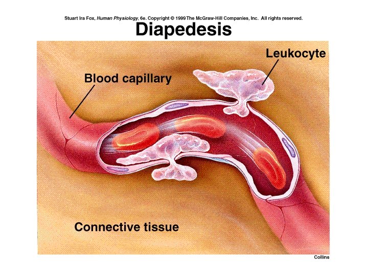 Inflammation • Allows more blood defenses into damaged areas • Triggered by release of paracrines from damaged tissues (PG), attacking WBCs (cytokines), mast cells (heparin and histamine), and activation of blood protective chemicals (complement and bradykinins) • Increases: – blood flow through vasodilation (hyperemia) – capillary permeability – Both lead to local edema • If prolonged or systemic, can become life threatening