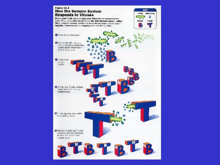 V. The T-cell role in the immune response Antigen (virus) enters body Macrophage ingests antigen and displays on the surface, helper T-cell recognizes antigen T-cell stimulated by helper T-cell Mitosis 10 -15 days Killer T-cells (eat antigens) Memory T-cells (1 -2 days response)
