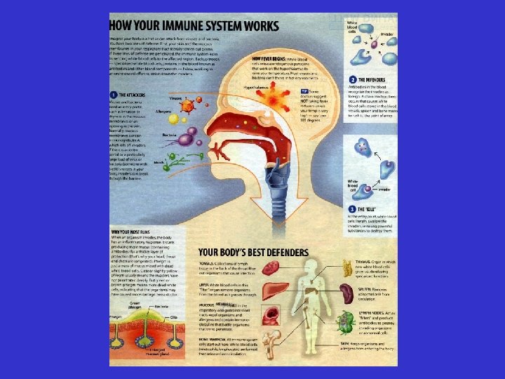 IV. The B-cell role in the immune response Antigen (bacteria) enters body Macrophage ingests antigen and displays on surface, helper T-cell recognizes antigen B-cell stimulated by helper T-cell Mitosis 10 -15 days Plasma cells which make specific antibodies and form antibody-antigen complex, which is eaten by phagocytes Memory B-cells which are responsible for rapid (1 -2 days) secondary immune response