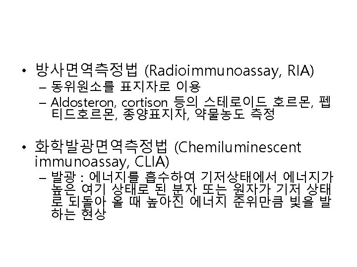 효소면역측정법(Enzyme immunoassay, EIA) – 효소를 표지자로 이용 – 효소 + 기질 반응 – 발색량을 분광광도계로 측정 – Alkaline phosphatase, horseradish peroxidase, B -galactosidase – Homegeneous EIA : enzyme multiplied immunoassay technique(EMIT) – Heterogeneous EIA : • Competitive • Non-competitive – 바이러스 항원, 항체, 종양 표지자 및 각종호르몬 의 측정