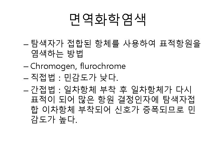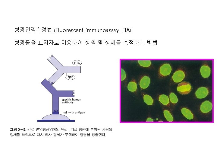 Fluorescence immunoassay • 원리 : fluorescent isothionate(FITC), 형광물질 표지