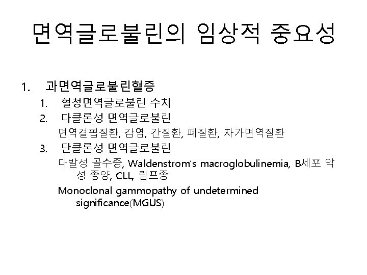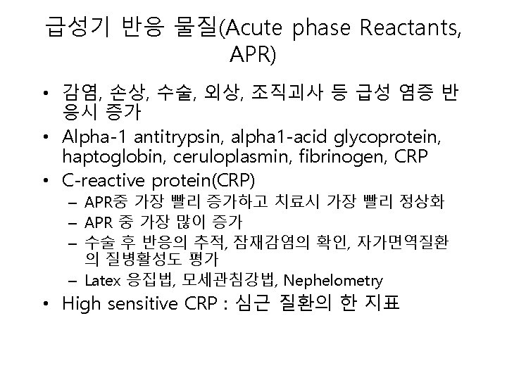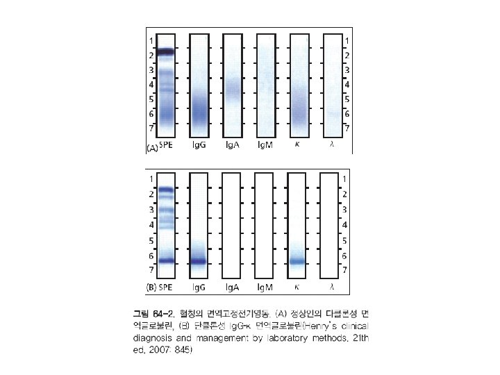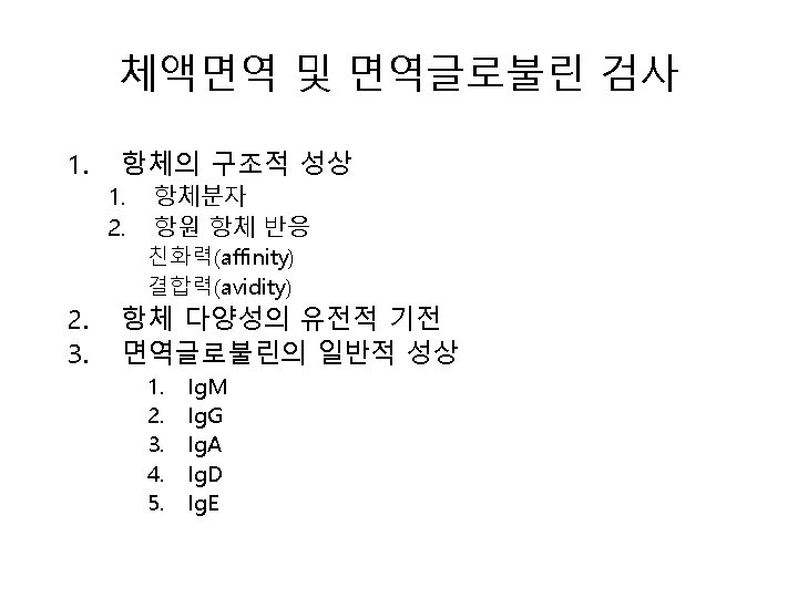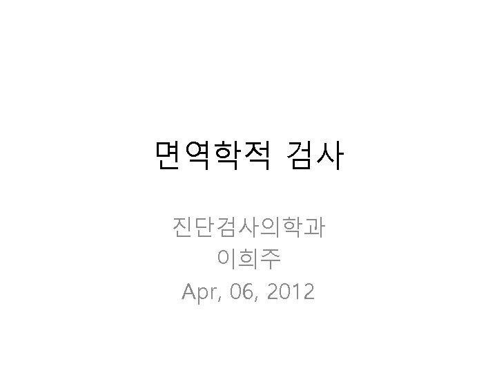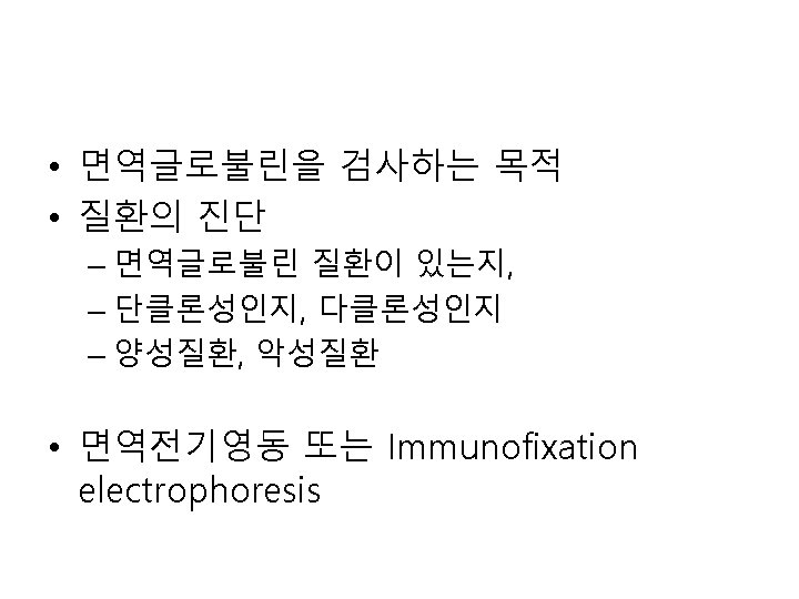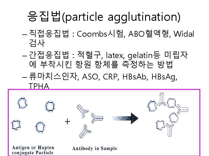 면역측정법 (Immunoassay)의 종류 • Precipitation(침강법) – Manual: Double immunodiffusion – Automation: Turbidimetry, nephelometry • Agglutination(응집법) – Manual: Latex agglutination, hemagglutination – Automation: Turbidimetry, nephelometry • EIA (효소면역측정법) – Colorimetric EIA – Fluorescent EIA – Chemiluminescent EIA • FIA (fluorescent immunoassay, 형광면역측정법) • CLIA (chemiluminescent immunoassay, 화학발광면역측 정법)