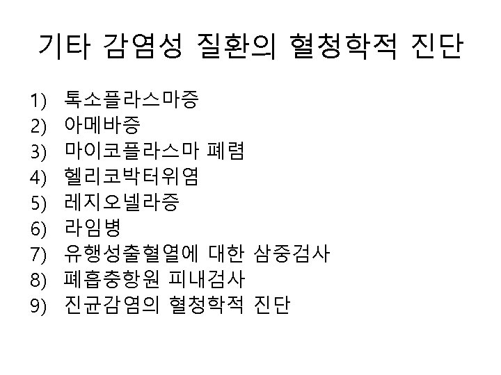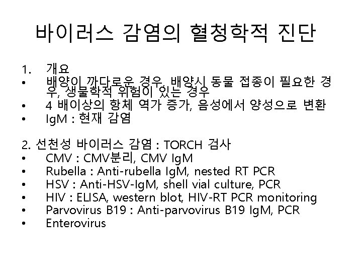 바이러스성 간염 • Hepatitis A – Anti-HAV Ig. M, HAV항원 : 대변, PCR • • • HEV : Anti-HEV, PCR HBV HCV HDV Epstein-Barr바이러스에 의한 전염성 단핵 구증