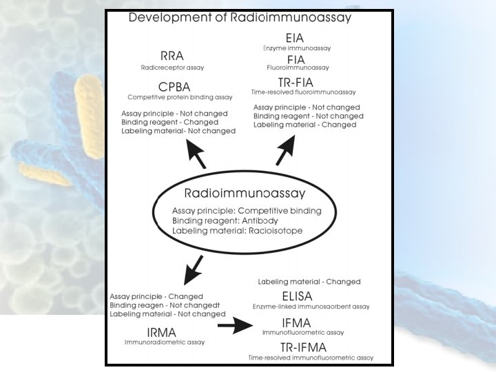 Brief history…. • Berson and Yalow’s discovery of the radioimmunoassay (RIA) for measuring insulin in 1959. • The enzyme immunoassay (EIA) was introduced in the 1960 s, bringing with it significant advantages, including the replacement of radioisotopes with enzymes, faster reaction times, higher specificities, and longer shelf-life than RIA. • Other immunoassays were developed, they all have the same principle, but differ in details.
