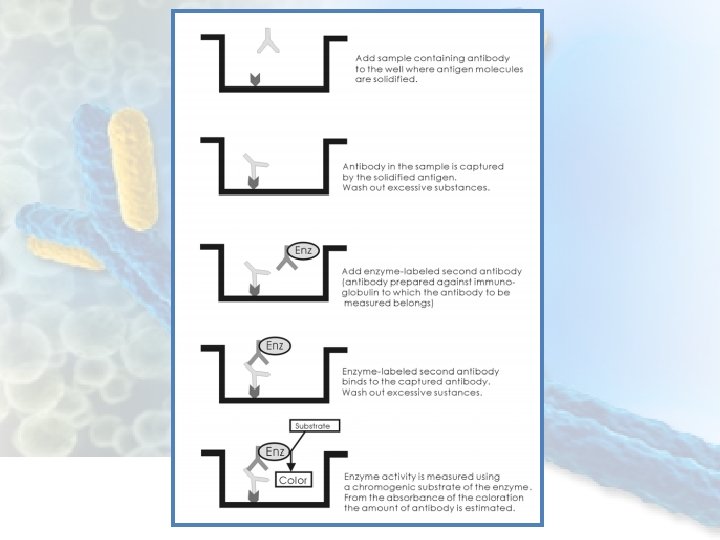 ELISA for measurement of antibody • ELISA system can be also set up for antibody measurement, called “ indirect ELISA”. • In this system, antigen molecule, specific to the antibody to be measured, is adsorbed on the bottom of wells, and samples containing antibody are added to the wells. For estimation of the captured antibody, the second antibody* labeled with enzyme is added and washed out after the binding reaction. Then by incubation with chromogenic substrate, the coloration is measured from the absorbance.