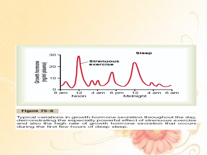 • Hyperglycemia inhibits growth hormone secretion. • Age, genes, sex, diet, exercise, stress, and other hormones is an important factors affect growth hormone concentrations. • At birth, GH is high and generally declines with the exception of a burst during the growth phase of adolestronce. • Women typically have a 50% higher level than their age-mached males.