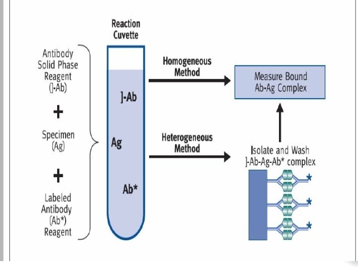 • Heterogeneous immunoassays require the separation of the immunocomplex from the free immunoreactants. – Solid phase is the most common way for separation. • But in homogeneous immunoassays, a modulation of the signal occurs as a result of the immunoreaction. Therefore the immunocomplex formation can be monitored directly without prior separation of the bound and free tracer.
