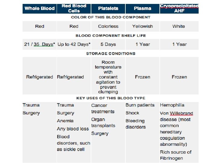 Cont The main transfusable blood components are: 1. Whole blood. 2. Red cells. 3. Platelets. 4. Fresh frozen plasma 5. Cryoprecipitate AHF (Antihemophilic factors).