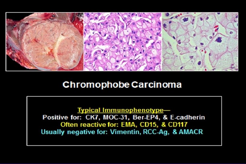 ADULT RENAL NEOPLASMS: Practical Differential Diagnoses • Conventional renal cell carcinoma (RCC) vs. Chromophobe carcinoma • RCC vs. Oncocytoma • RCC vs. Angiomyolipoma • High-grade RCC vs. Anaplastic TCC • RCC vs. Adrenocortical carcinoma • Sarcomatoid RCC vs. True renal sarcoma • Metastatic RCC versus: – – – – Primary or metastatic lung carcinoma Primary or metastatic hepatocellular carcinoma Primary or metastatic melanoma Primary clear-cell thyroid carcinoma Primary or metastatic clear-cell Mullerian carcinoma Primary or metastatic germ cell tumor Gastrointestinal stromal tumor Malignant mesothelioma