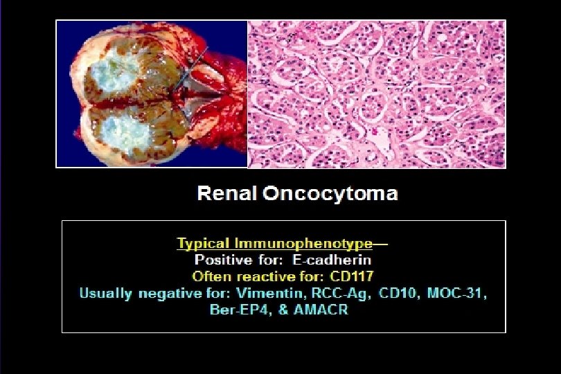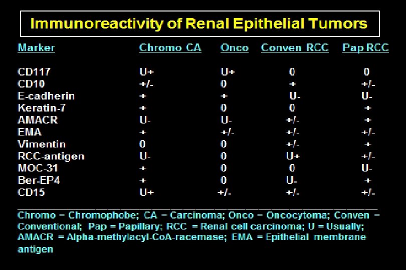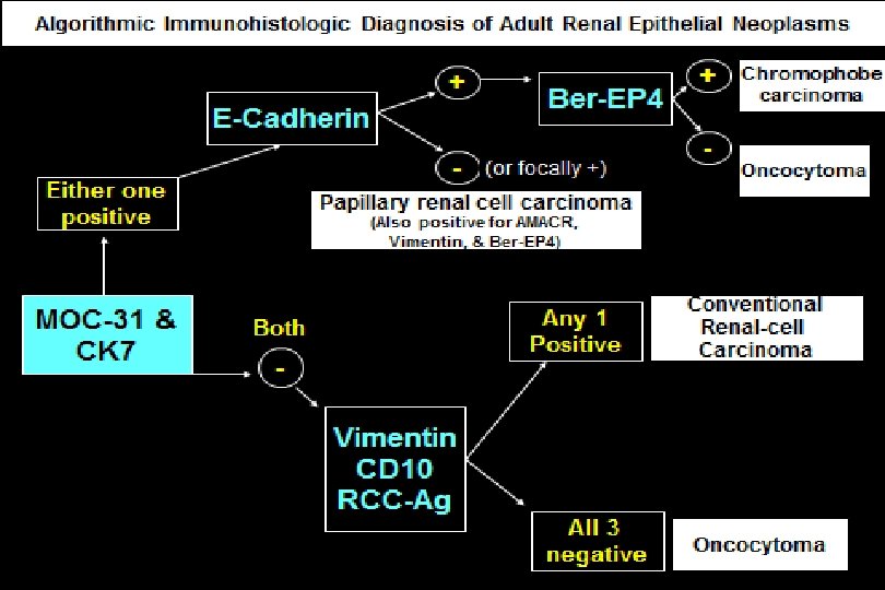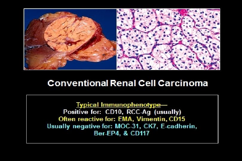HIGH-GRADE INTRARENAL TCC VS. RCC • Intrarenal TCC-– Reactive for thrombomodulin, GATA 3, & p 63, and often for CK 20, CA 19 -9, CEA, & CD 5/6 – Negative for “RCC, ” PAX 2, & PAX 8 • Renal cell carcinoma-– Potentially reactive for “RCC; ” consistently labeled for PAX 2 + PAX 8 – Nonreactive for p 63, GATA 3, thrombomodulin, CK 20, CA 19 -9, CEA, and CK 5/6