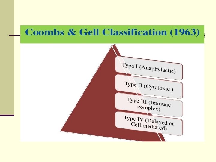 n Coombs and Gell classification 1 -Type I - immediate ( atopic, or anaphylaxis) 2 -Type II - antibody-dependent(Cytotoxic hypersensitivity) 3 -Type III - immune complex mediated hypersensitivity 4 -Type IV - cell-mediated or delayed hypersensitivity 5 - Type V – Recently a fifth type of hypersentiv, known as stimulatory type , has been lncluded