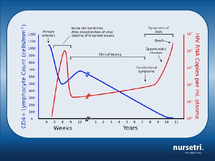 Asymptomatic HIV infection • This stage lasts for an average of 7 to 10 years • Free from major symptoms (lymphadenopathy) • Viral load drops from seroconversion but remains infectious • HIV antibody positive • Not dormant, very active in the lymph nodes