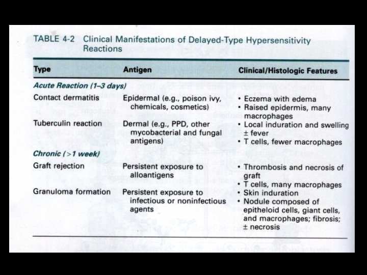 Stages of Type IV DTH Effector stage • Secondary contact yields what we call DTH • Th 1 memory cells are activated and produce cytokines. – IFN-γ, TNF-α, and TNF-β which cause tissue destruction, inflammation – IL-2 that activates T cells and CTLs – Chemokines- for macrophage recruitment. – IL-3, GM-CSF for increased monocyte/macrophage