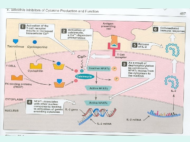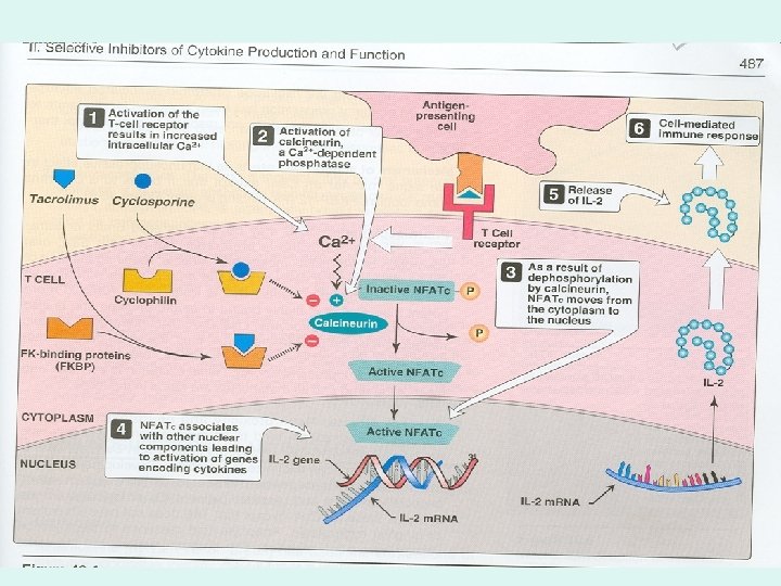 Selective Inhibitors of Cytokine Production (Drugs Acting on Immunophilins) • 1) Cyclosporine (Cyclic peptide from Soil Fungus (1971) – MOA: (See Figure 40. 4) • Cs. A binds to cyclophillin forming a comlex Bind to Calcineurin dephosphorylation NFATc Synthesis of IL 2 proliferation of T cells • Thus, decreases the level of IL-2, the primary chemical stimulus for increasing the number of T lymphocytes • Note: Suppress only cell immunity with no effect on humoral immunity.