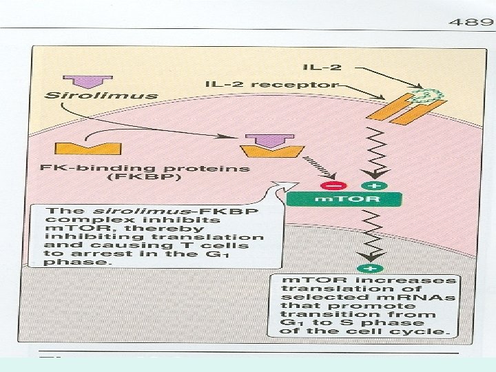 • 3. Sirolimus (Rapamycin Maclolides) – MOA: • 1) Binds to the same immunophilin as Tacrolimus, but does not form a complex with calcineurin, instead, it binds to m. TOR (Mammalian Target of Rapamycin) which is essential for many cellular functions (See Figure 40. 6) • 2) Sirolimus does not affect IL-2 production, unlike Cs. A & TAc, rather inhibits T-cell response to it (Blocks cytokine-stimulated cell proliferation) • 3) Potent inhibitor of B-cell proliferation and immunoglobulin production (humor immunity)