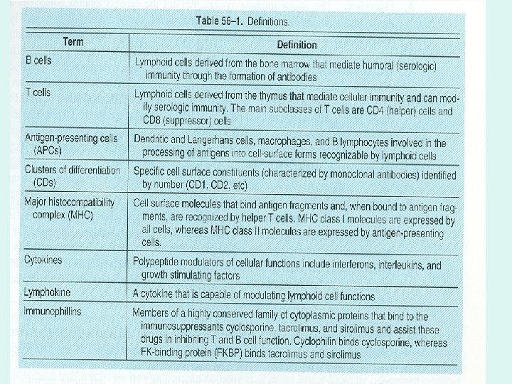 Immunosuppressants Prof. Alhaider, 1431 H I. II. Definition Clinical Uses (Organ transplants & Autoimmune diseases) Pre-requisite to understand immunosuppressive drugs (Basic immunology). Review of immune system (see Table 56 -1) III. IV. I. III. IV. Cell mediated vs humoral immunity Importance of cytokines Immunophilins Calcineurin