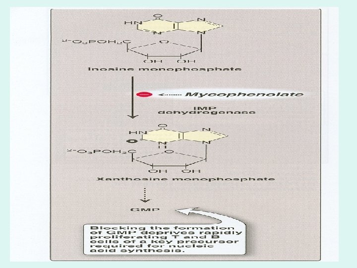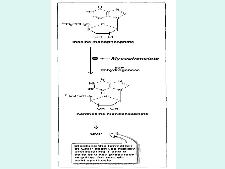 • 2) Mycophenolate Mofetil (Cellcept. R) – The most important discovery among the immunosuppressant agents. – MOA: (See Figure) • Mycophenolic acid acts as non-competitive, selective 7 reversible inhibitor of inosine monophosphate dehydrogenase • Decreases GMP, which is a key enzyme in the de novo pathway of purine synthesis. This leads to suppression of both B and T lymphocyte activation. • PK: Good oral absorption; – Side Effects • Less than azathioprine, Bone marrow suppresion (leukopenia and anemia); NV and diarrhea (decresed by Enteric-coated form). • Unlike azathiorine it is teratogenic.