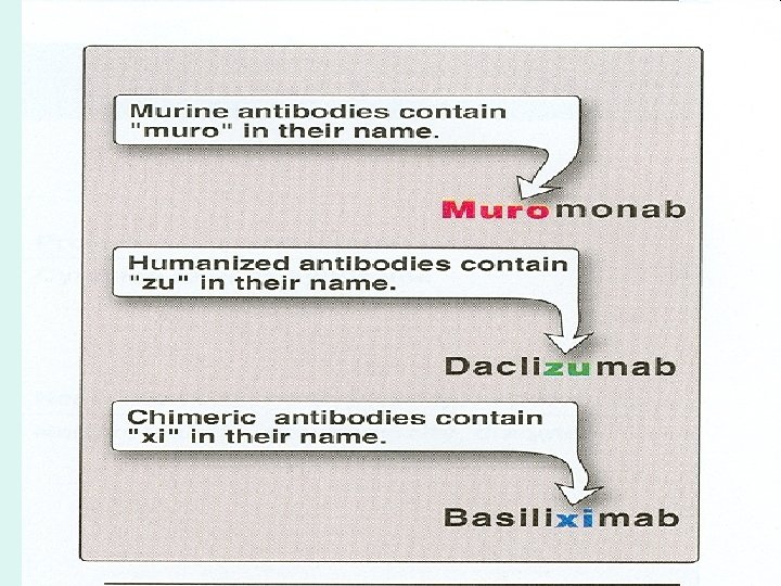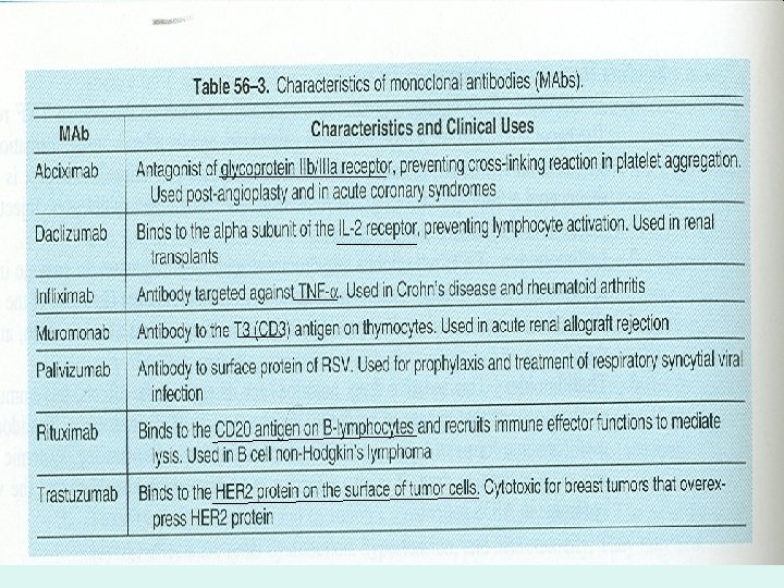 • 2) Modified Types of monoclonal antibodies (e. g: Selective Inhibitors of IL 2): • Note: Monoclonal Antibodies are not limited for immunosuppression but could be utilized for other purposes (See Table 56 -3) • By using the genetic engineering, most murine amino acids of Muromonab have been replaced by human ones; producing monoclonal antibody designated humanized (e. g. Daclizumab; Transtuzumab). While the chimeric (Mixed) antibodies contain XI in their name (e. g. Abciximab; Infliximab; Rutuximab). • Clinical Uses: See Table 56 -3 • Advantages over polyclonal antibodies